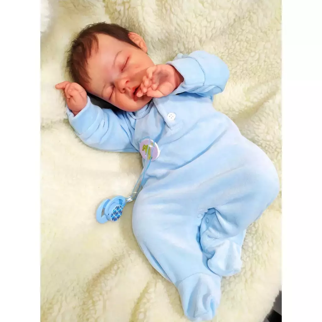 Ele tem aproximadamente 49 cm e 2kilos o corpo bem macio e gostoso de carregar, vai com cabelinho implantando fio a fio feito com muita delicadeza e dedicação.