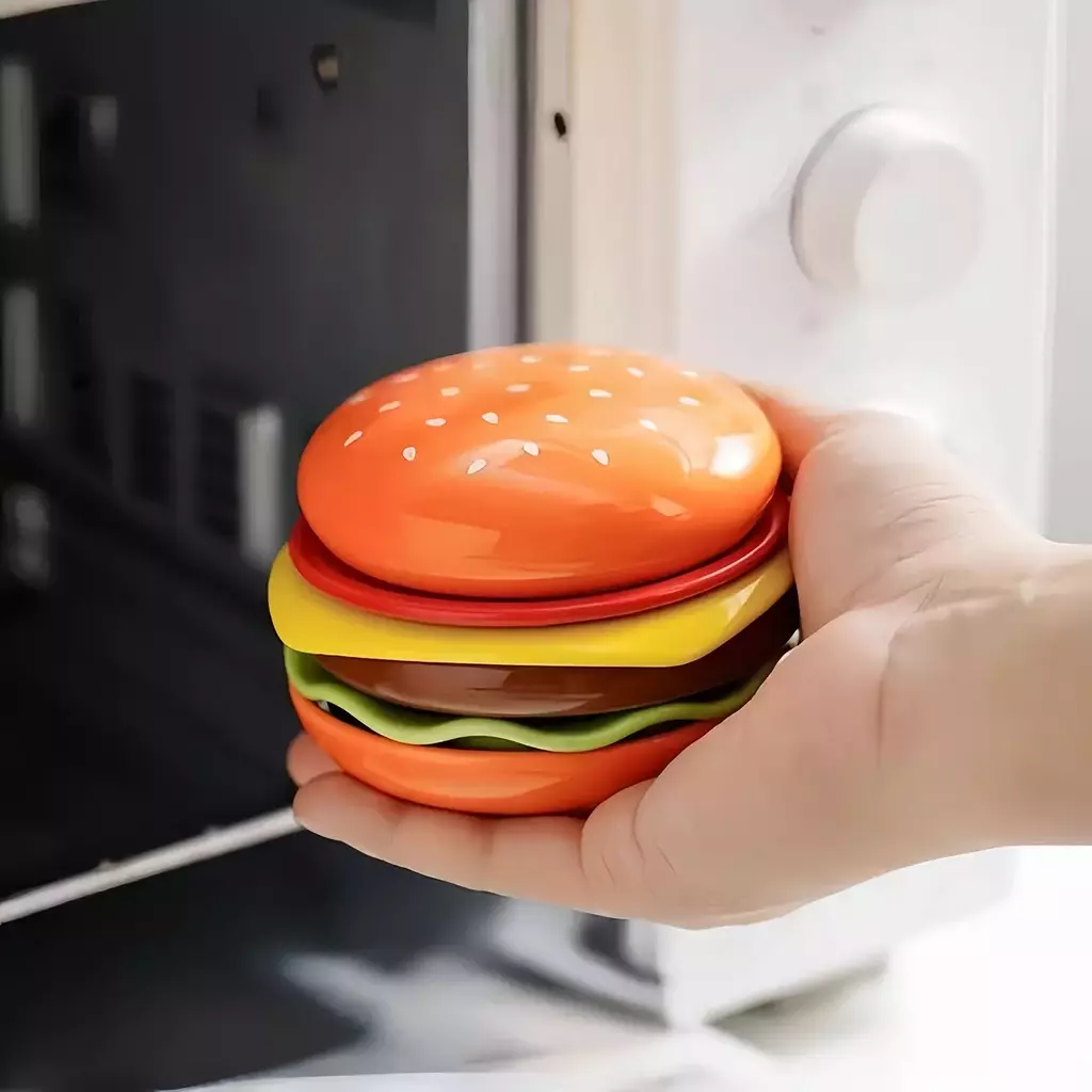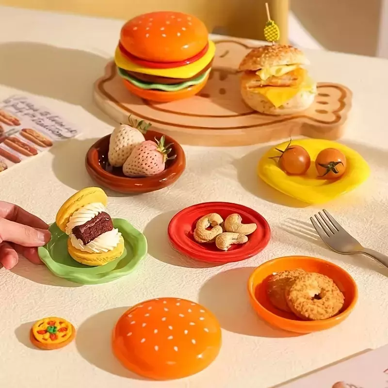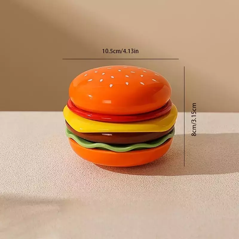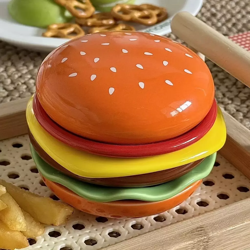 CONJUNTO DE 6 PRATOS EM FORMATO DE HAMBÚRGER. Os pratos são empilháveis e se assemelham a um hambúrguer, com cada camada representando um componente diferente: pão, queijo, carne, alface, etc.