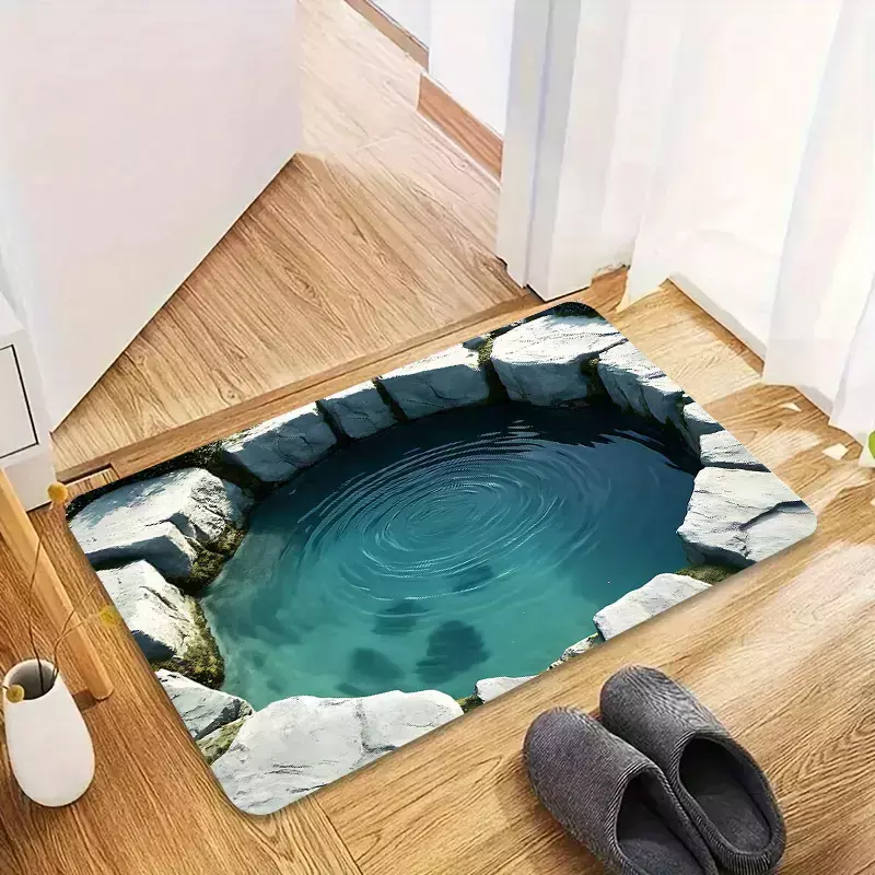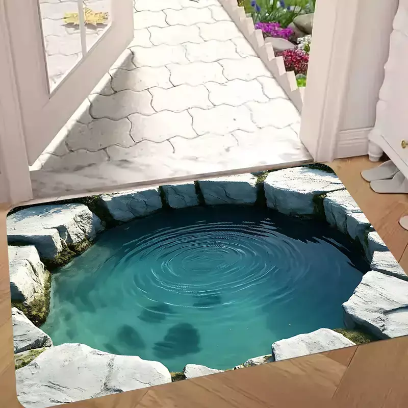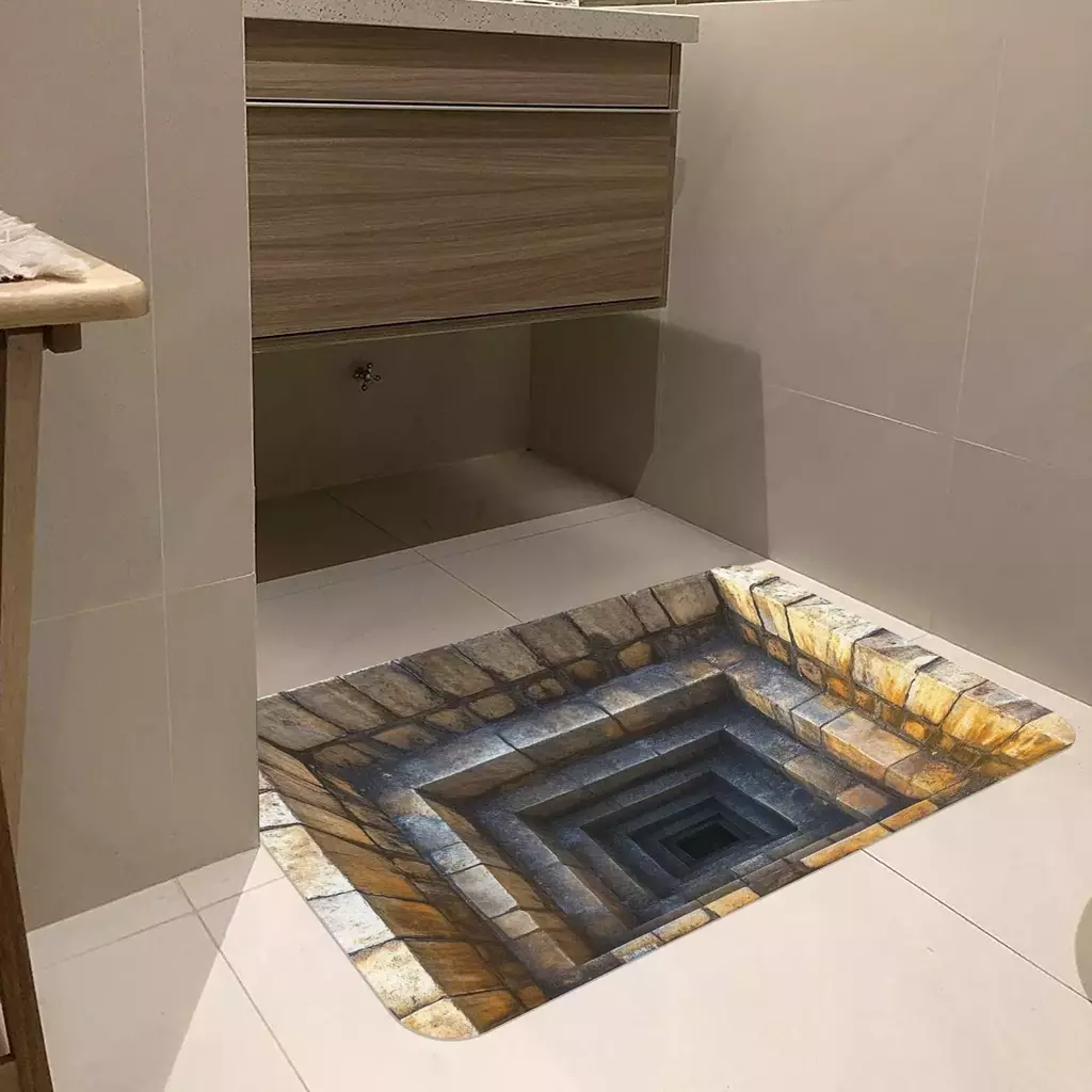 TAPETE BOAS VINDAS ILUSÃO DE ÓTICA 3D com base antiderrapante em borracha,100% poliéster para interior e exterior com design de ilusão.